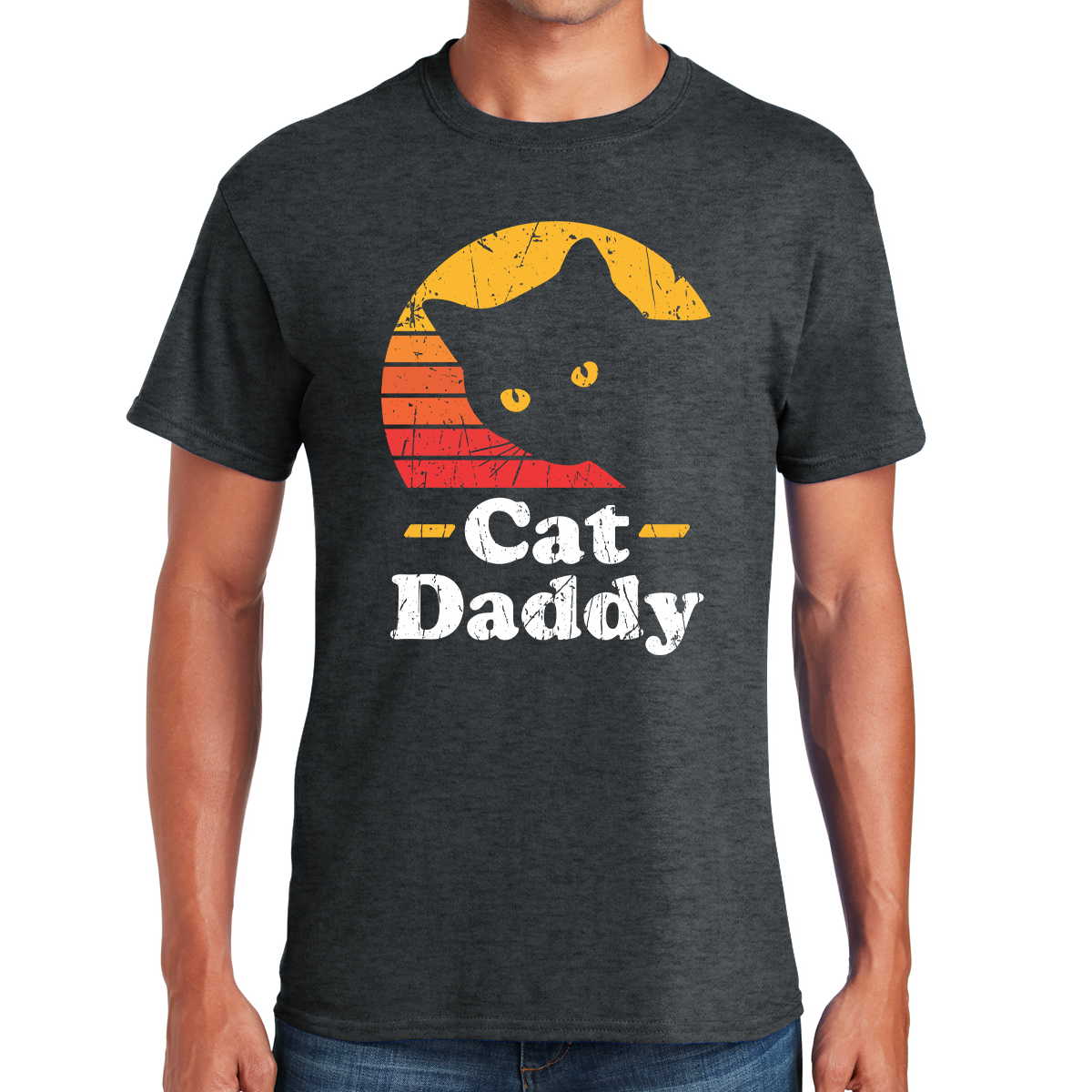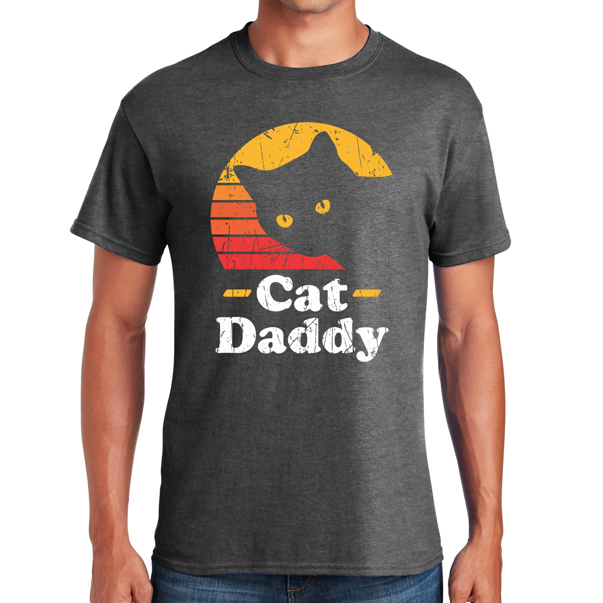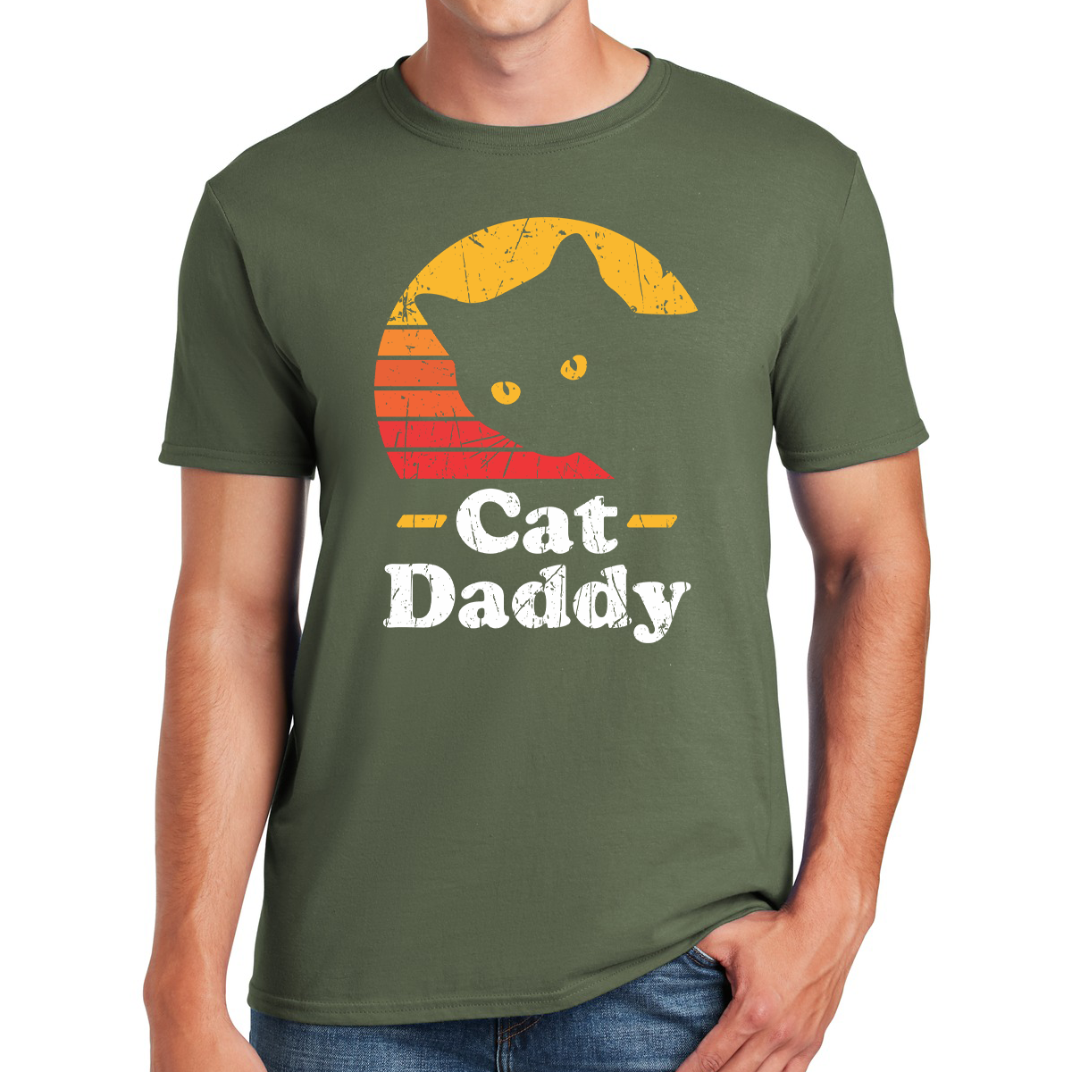 The front of the T-shirt proudly showcases the message, "Cat Daddy," with a vintage-inspired sunset design. The text is designed in a retro font, reminiscent of classic typography from the past, giving the shirt a nostalgic and timeless feel. This design element pays tribute to the enduring love and connection between cat dads and their furry friends.