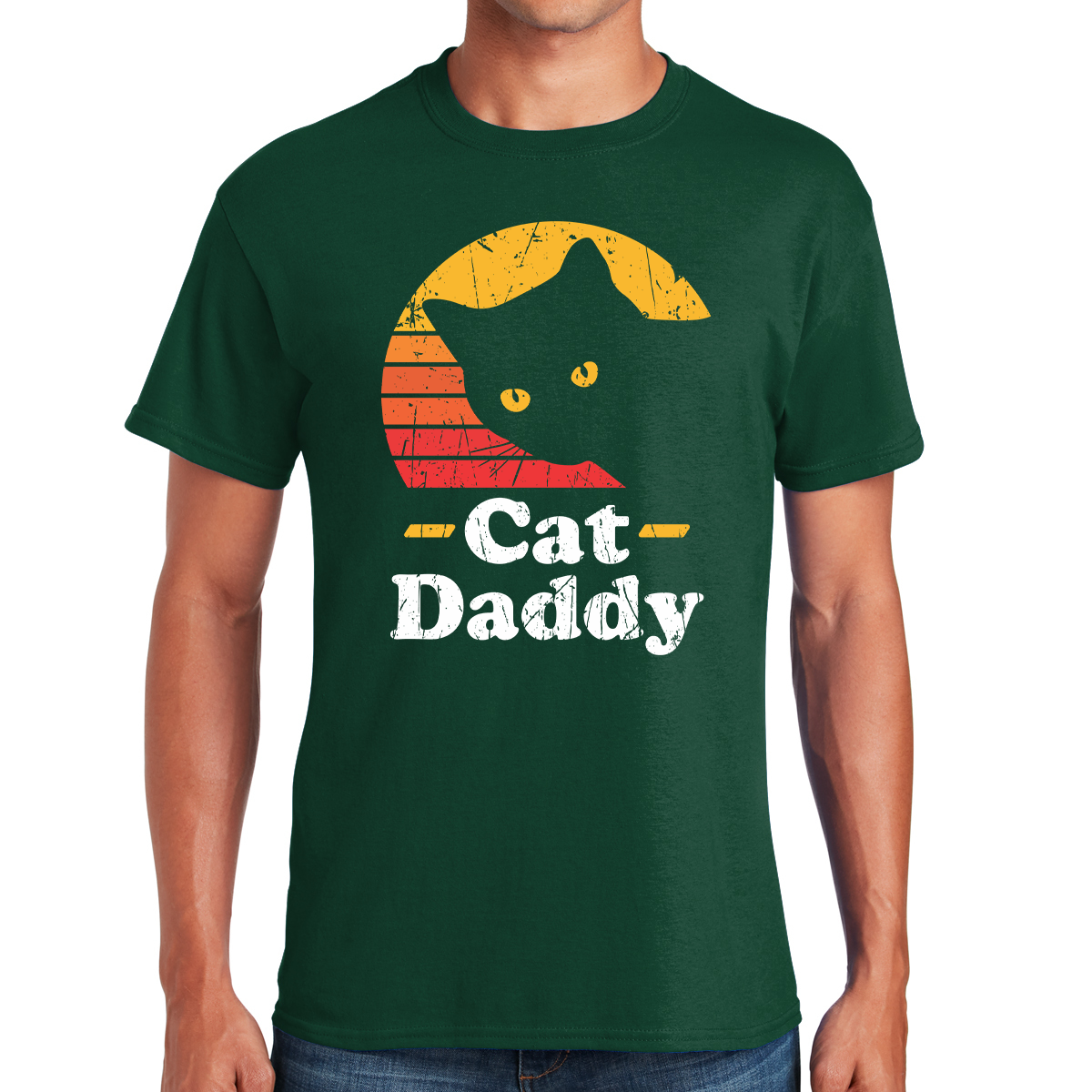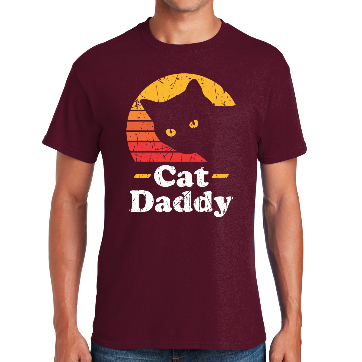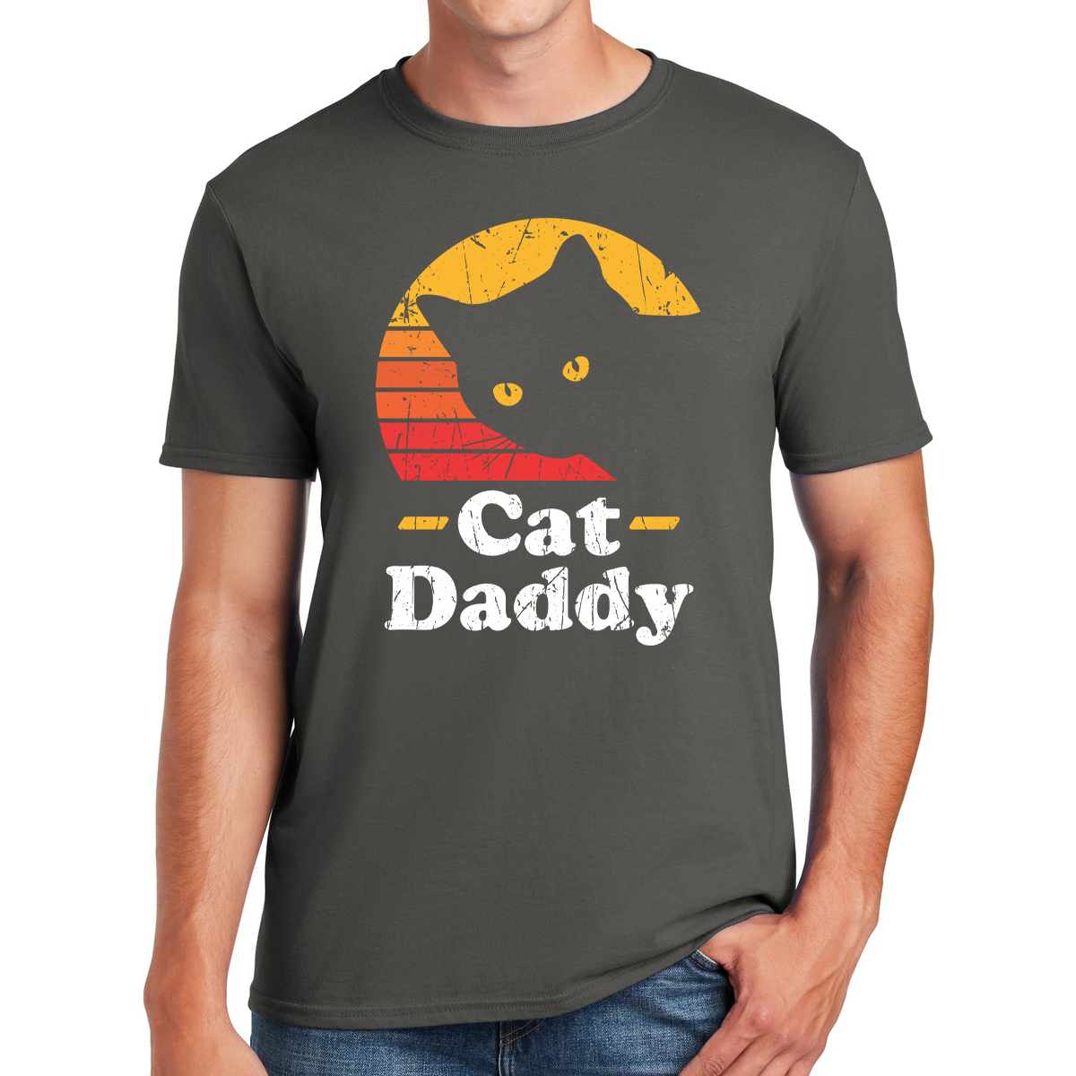 The front of the T-shirt proudly showcases the message, "Cat Daddy," with a vintage-inspired sunset design. The text is designed in a retro font, reminiscent of classic typography from the past, giving the shirt a nostalgic and timeless feel. This design element pays tribute to the enduring love and connection between cat dads and their furry friends.