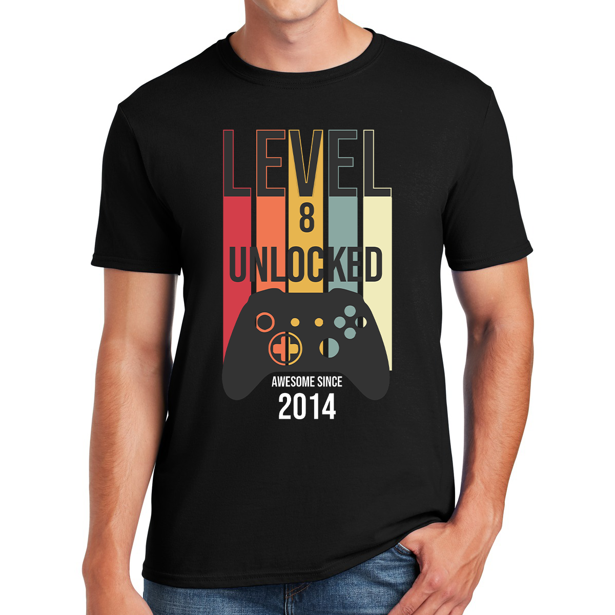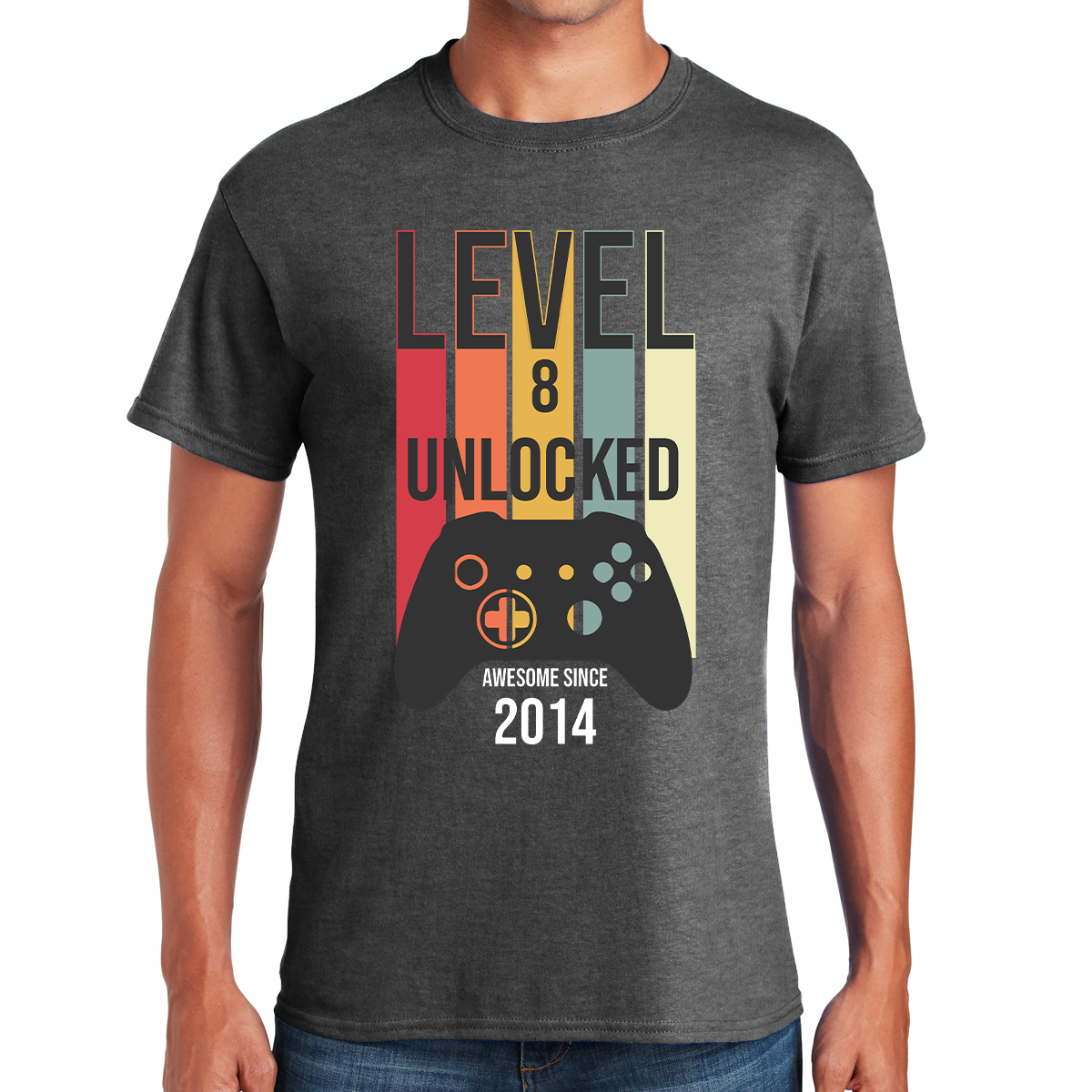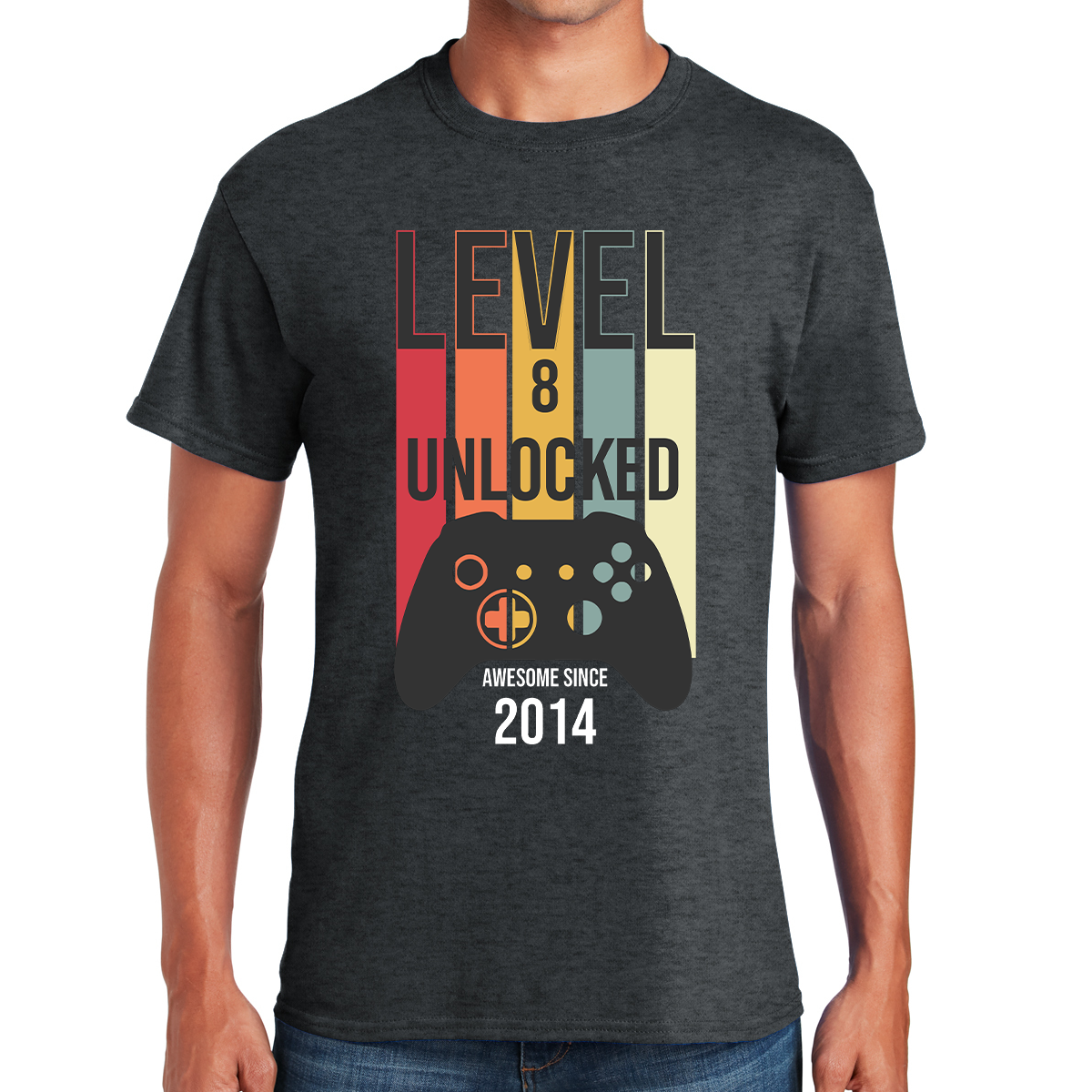 Introducing our latest t-shirt design: "Level 8 Unlocked: Awesome Since 2014 - Gaming Dad Achievement."
