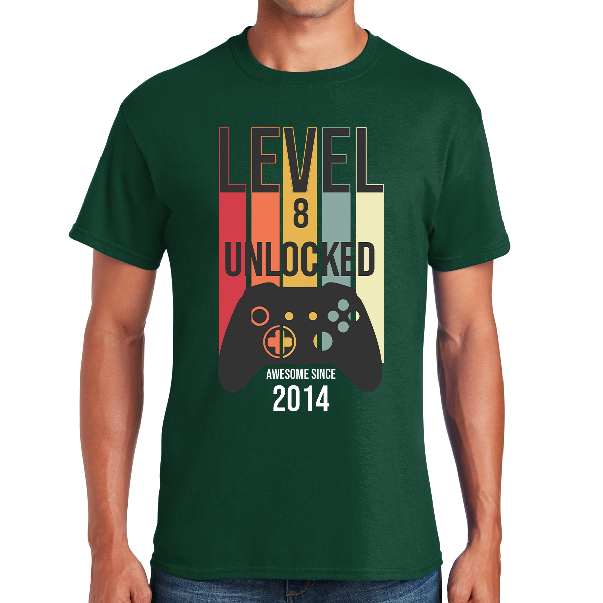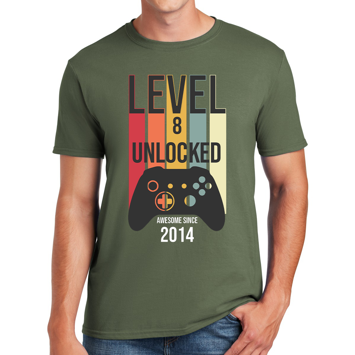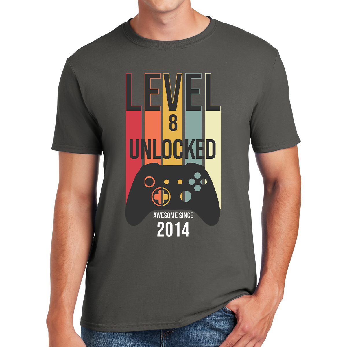 Introducing our latest t-shirt design: "Level 8 Unlocked: Awesome Since 2014 - Gaming Dad Achievement."