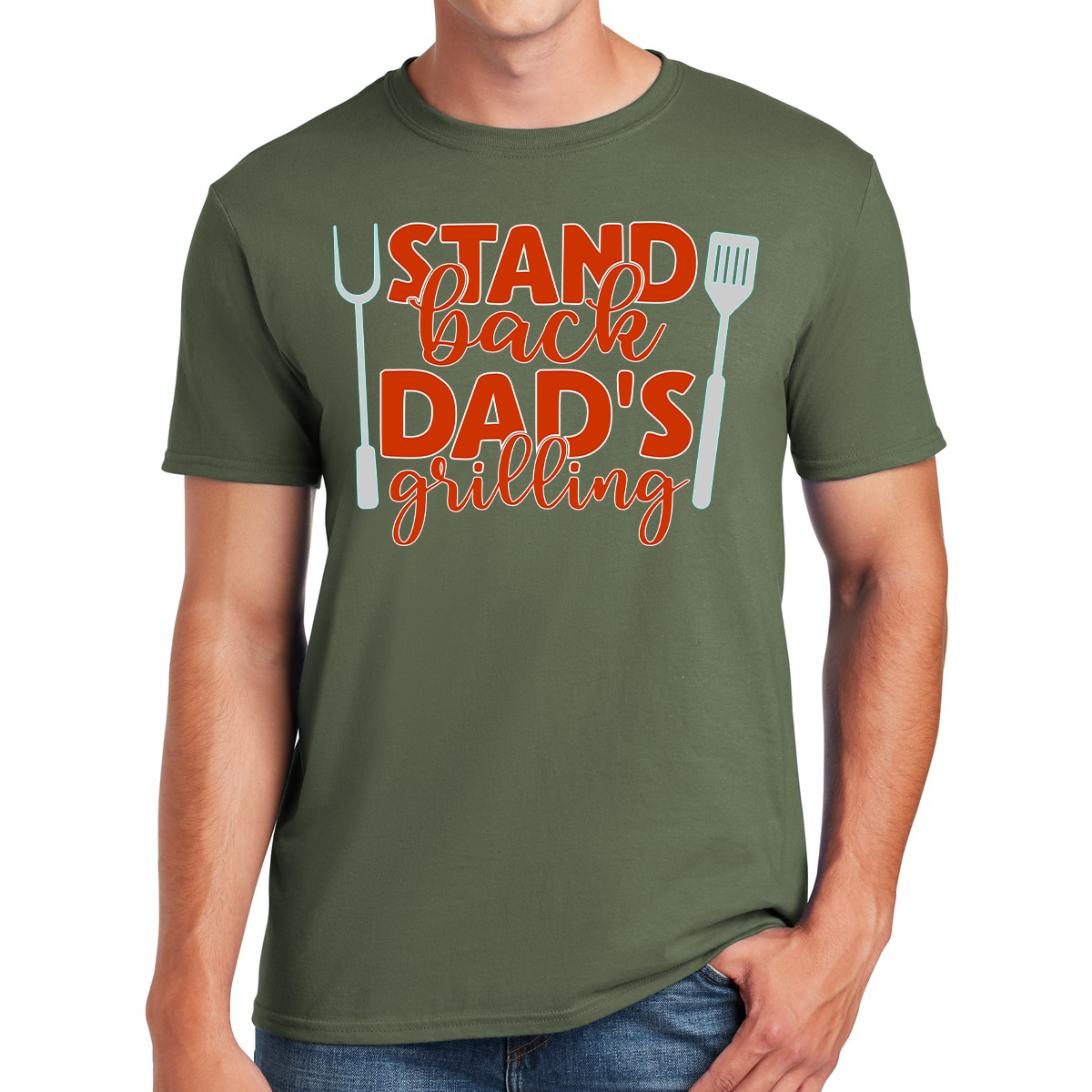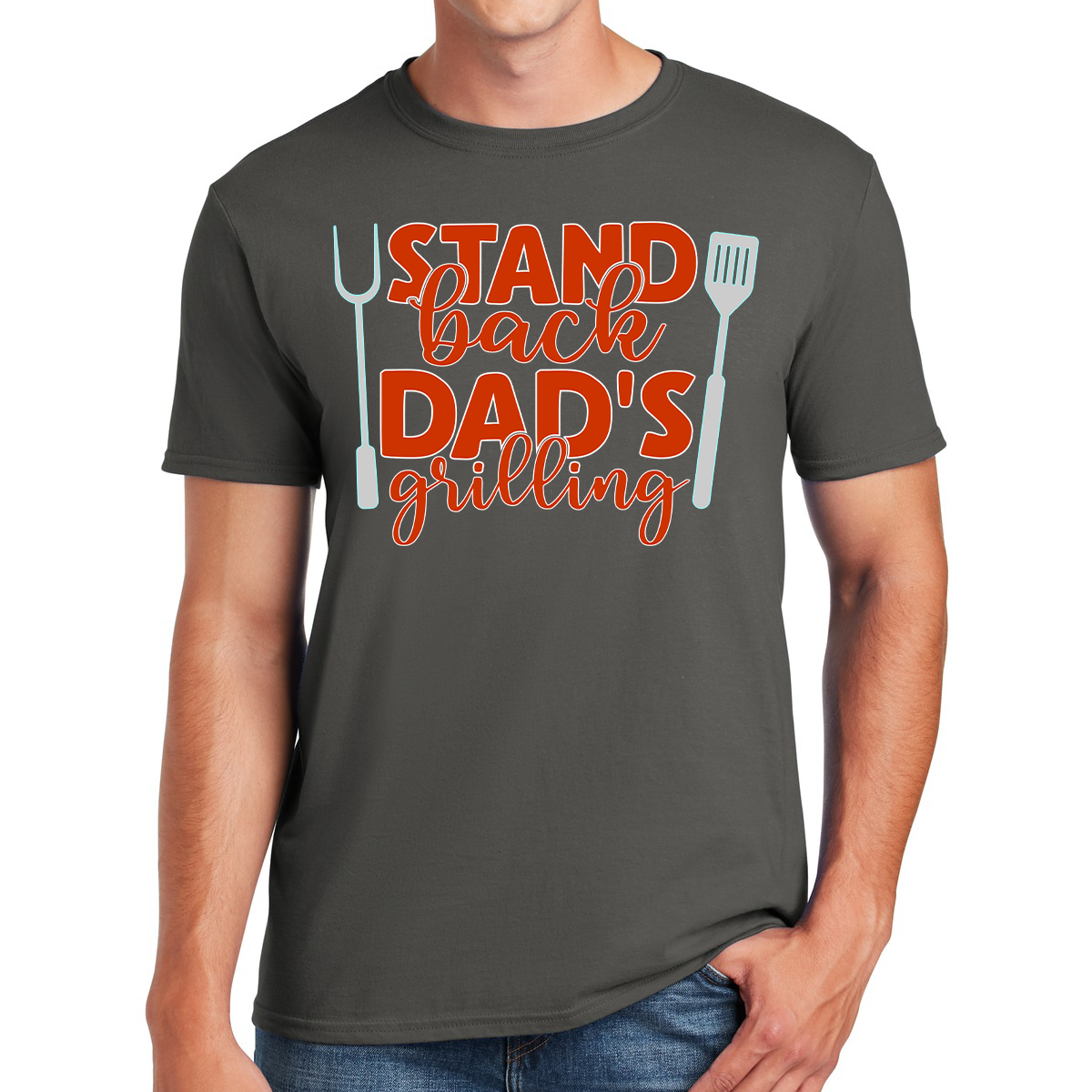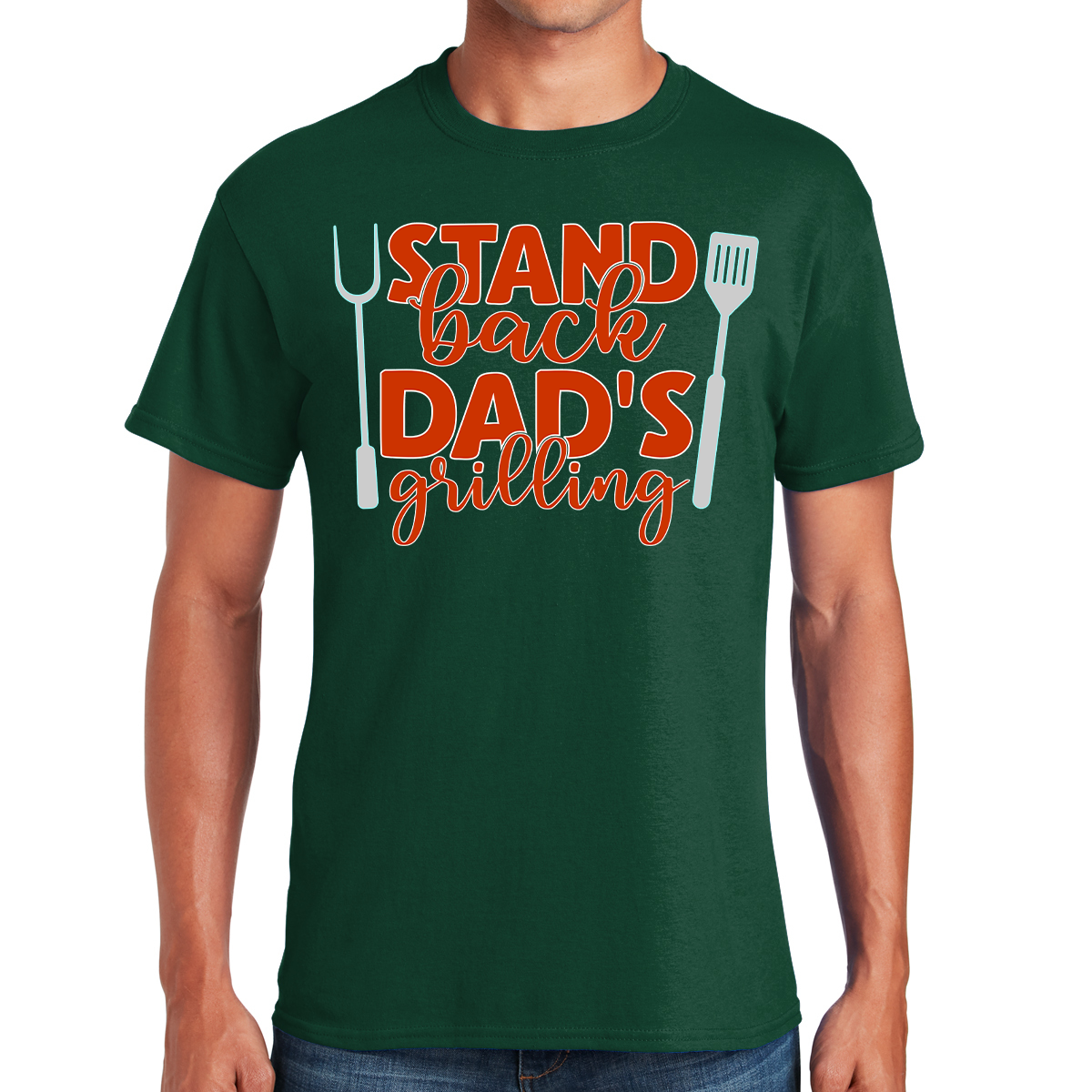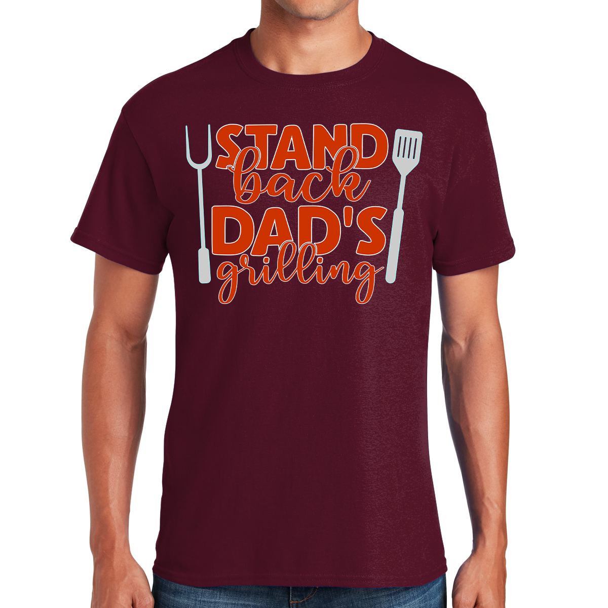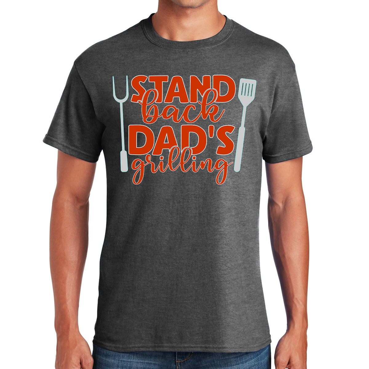 The front of the T-shirt playfully declares, "Stand Back, Dad's Grilling: Fire and Flavor in Progress." The text is designed in a bold and captivating font that instantly grabs attention and conveys the idea that when Dad is at the grill, something delicious is in the works. It's a humorous nod to the excitement and anticipation that surrounds Dad's barbecue sessions.