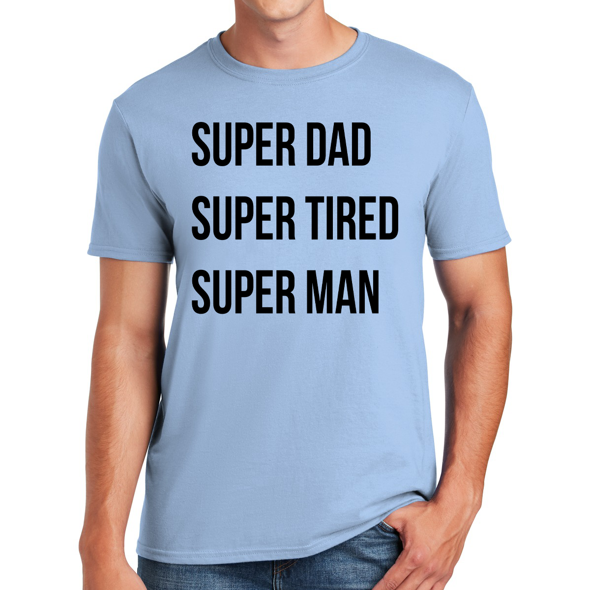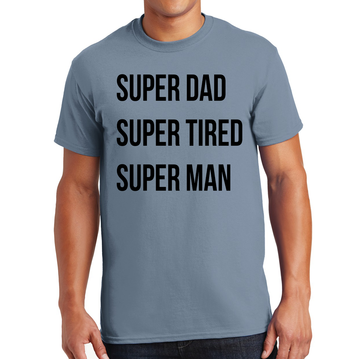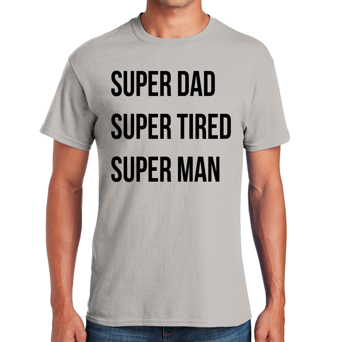 The phrase, "Super Dad, Super Tired, Super Man," takes center stage in the design, symbolizing the superhero-like qualities that fathers possess as they navigate the joys and challenges of parenting.