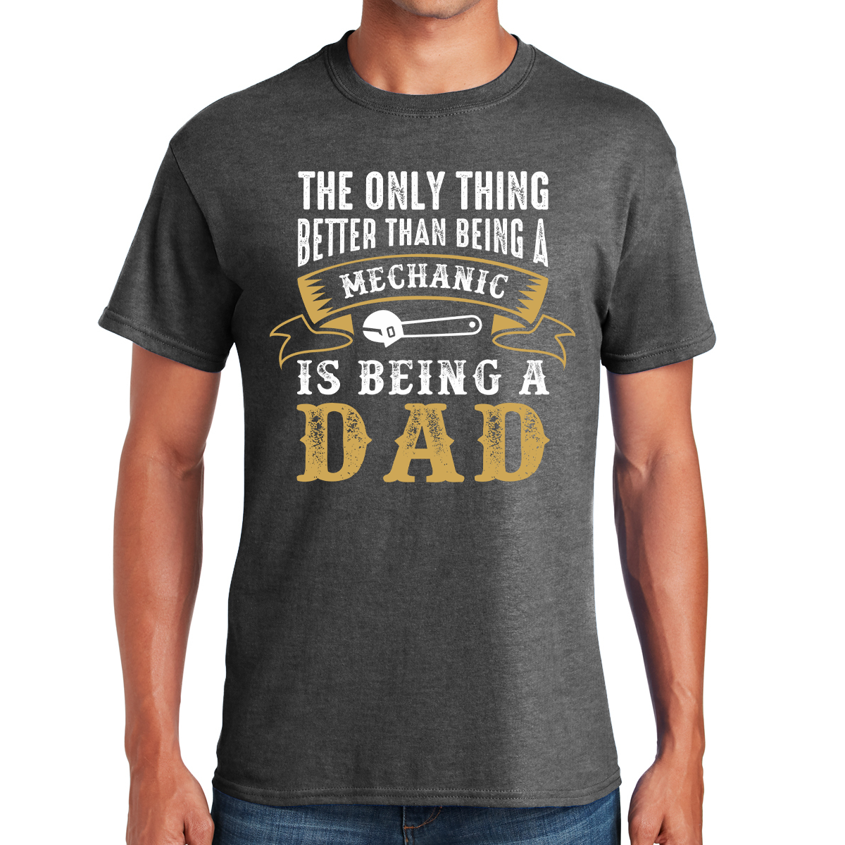 The front of the T-shirt proudly conveys the message, "The Only Thing Better Than Being A Mechanic Is Being A Dad: Fixing Hearts and Machines." The text is designed with a warm and engaging font that captures attention and conveys the idea that being a dad who fixes both hearts and machines is something truly special. It's a heartfelt nod to the dual role you play in your family's life.
