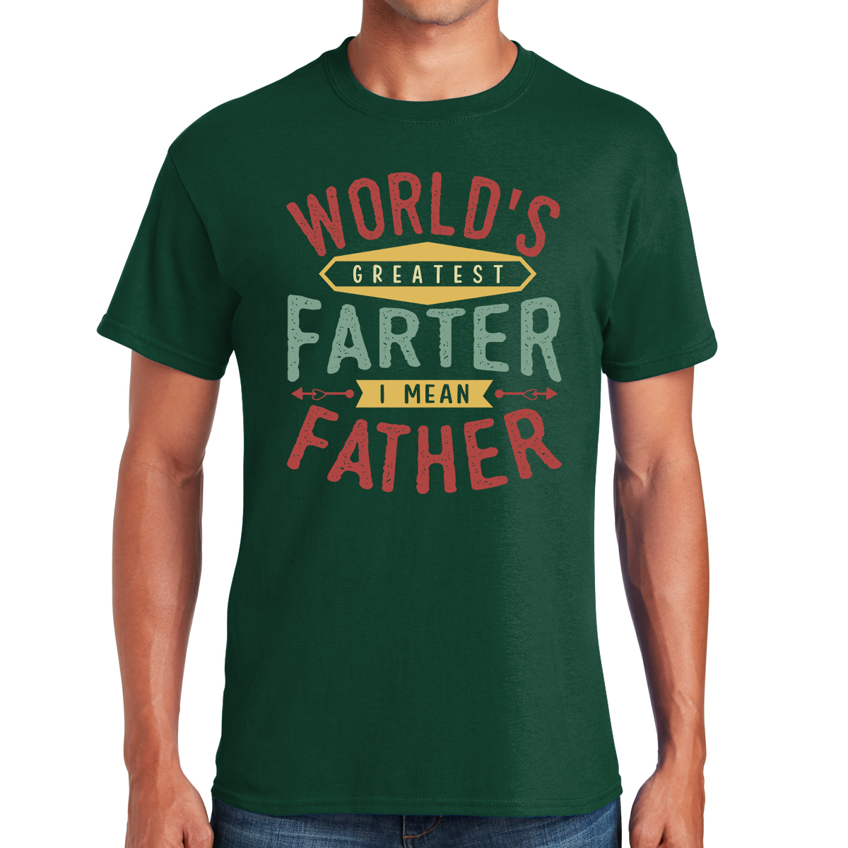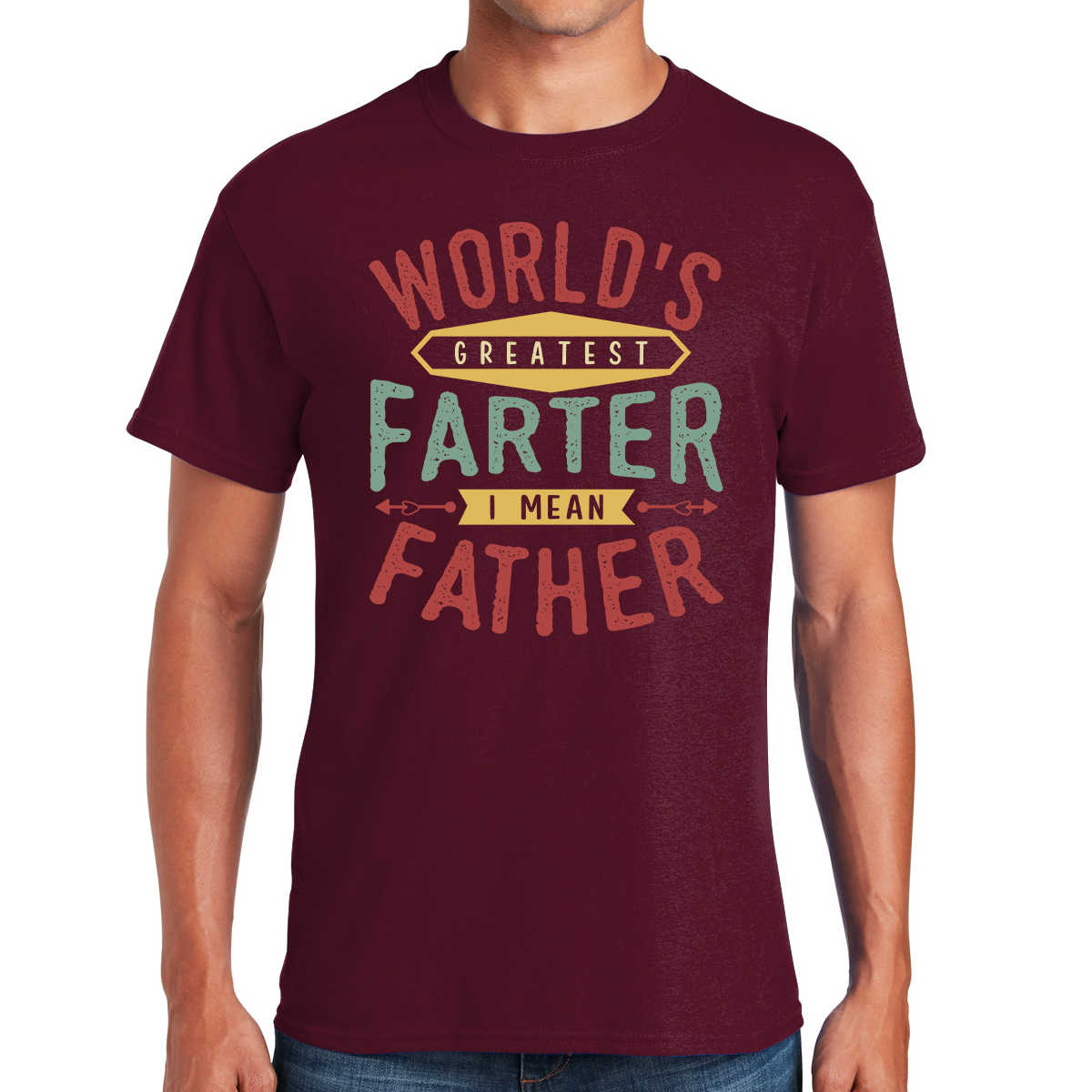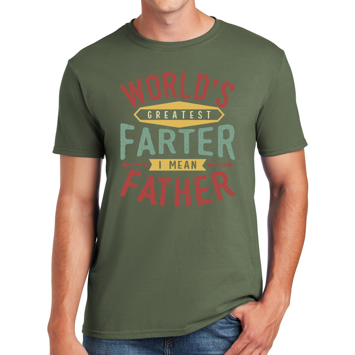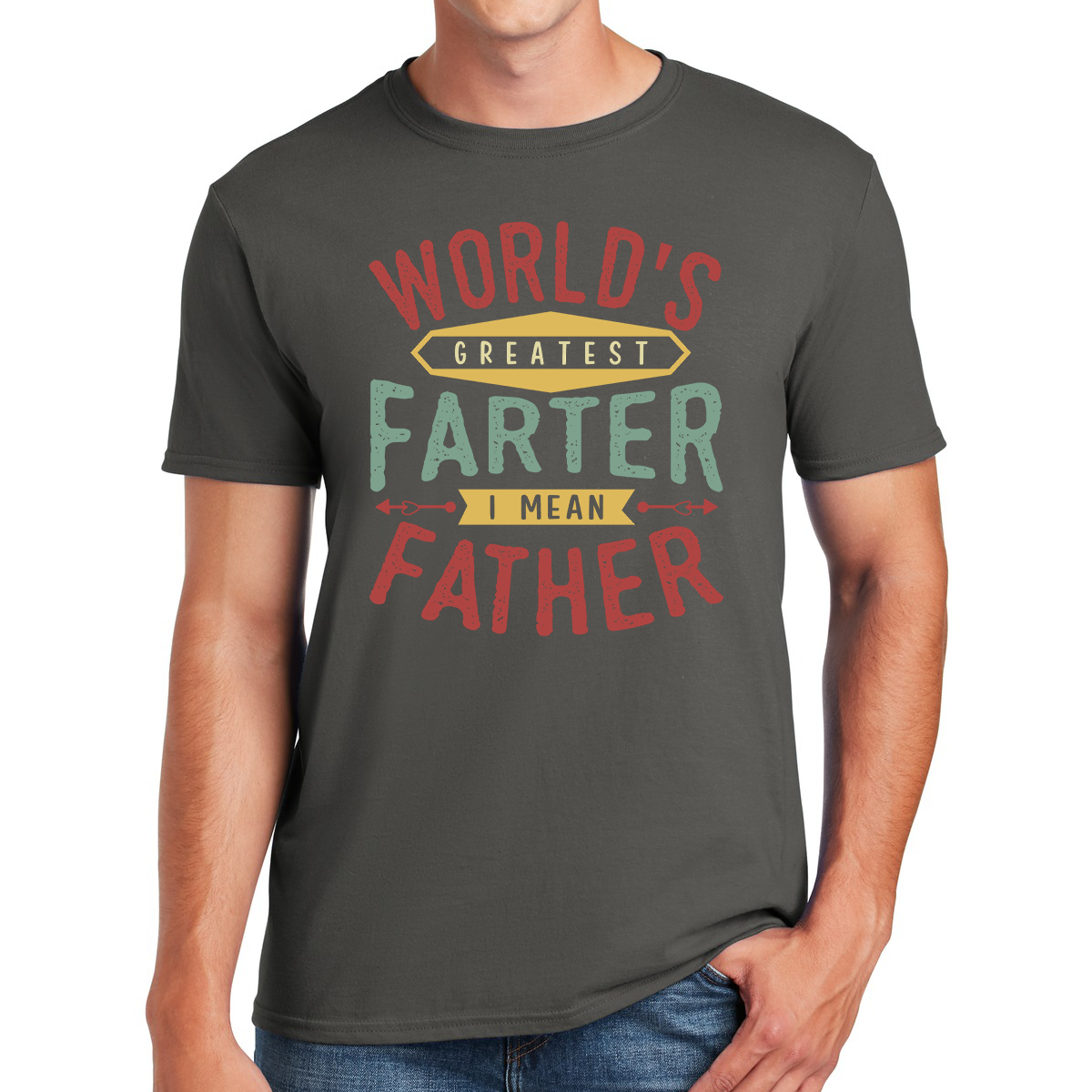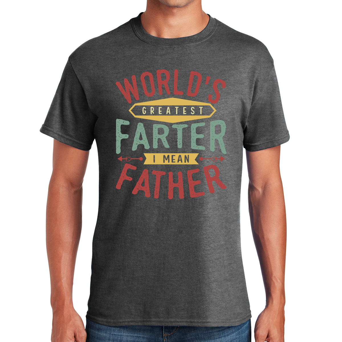 The front of the T-shirt humorously declares, "World's Greatest Farter, I Mean Father." The text is designed in a fun and quirky font that instantly captures attention and conveys the idea that being a dad often involves a healthy dose of humor. It's a tongue-in-cheek way to acknowledge the comical moments and inside jokes that dads and their families share.